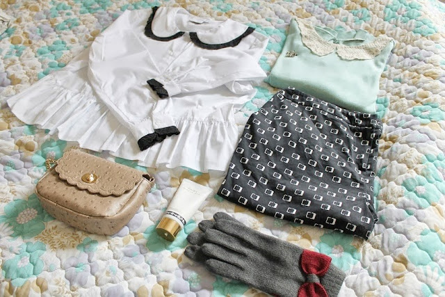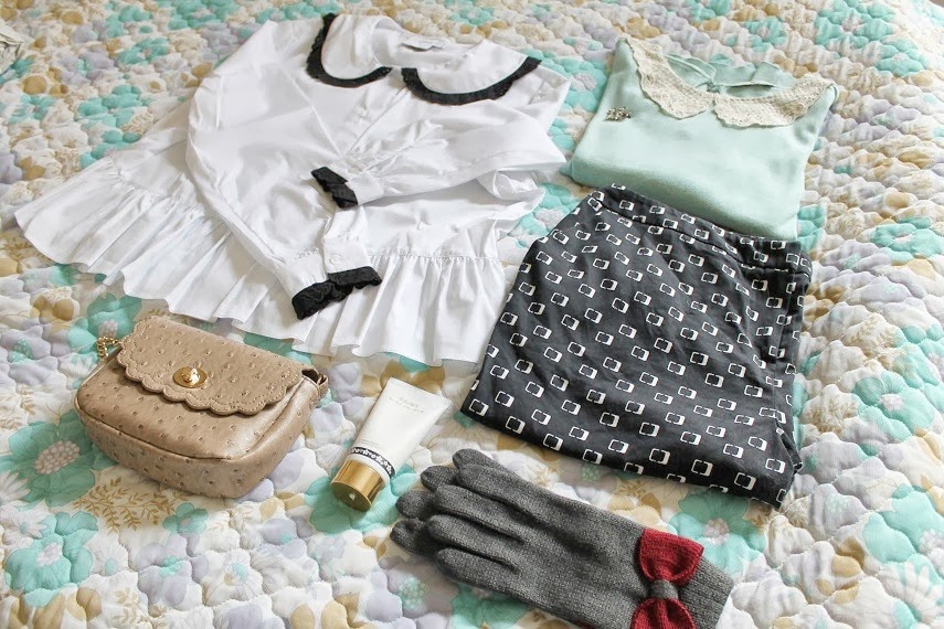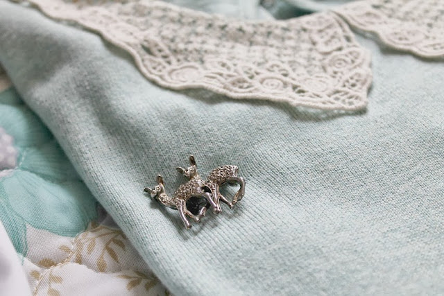 blouse: ASOS, jumper: TU at Sainsburys, deer brooch: charity shop, trousers: TU at Sainsburys, bag: ASOS, daisy body lotion: car boot, bow gloves: ASOS