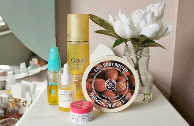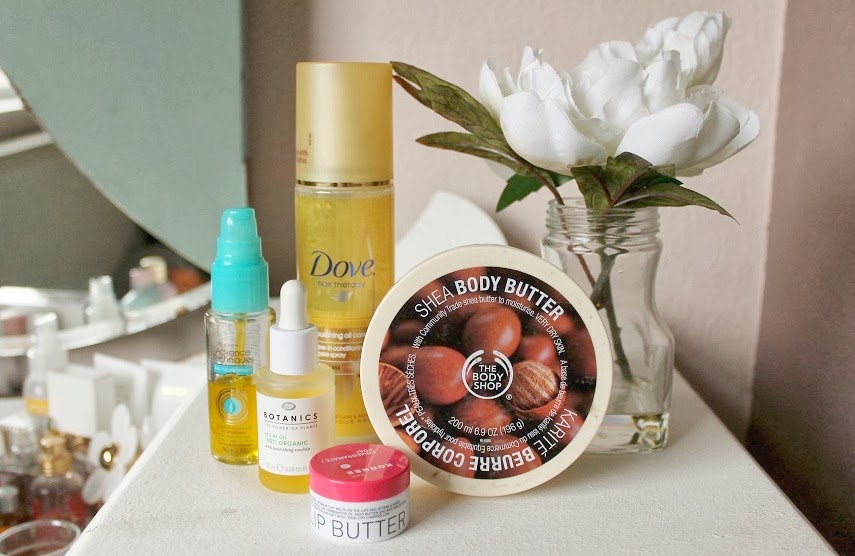 avon advance techniques argan oil leave in treatment | botanics organic facial oil | dove nourishing oil care leave-in spray | body shop shea body butter | korres pomegranate lip butter