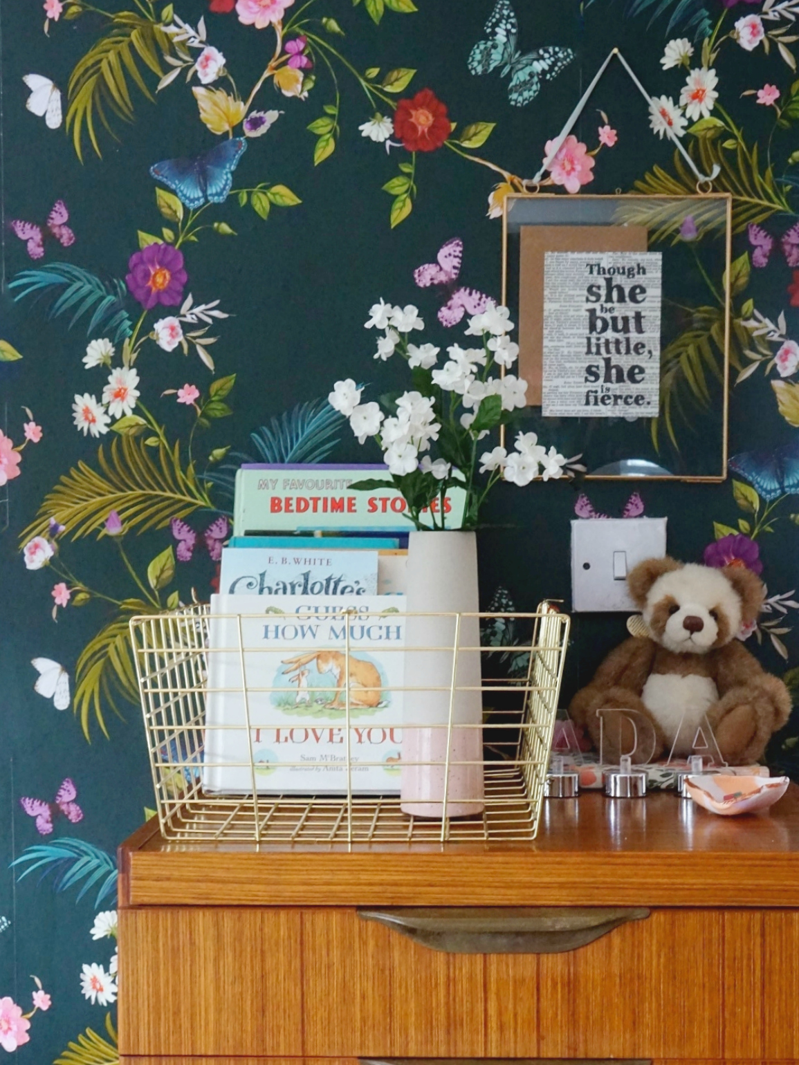 Ada's first bedroom (which you can have a little peek at here!) was a typical girls nursery; baby pink walls, lots of bright colours and babyish accessories everywhere. I wanted something a little more mature that she can grow into, but at the same time not a room that looks as though it belongs to a teenager. It took me a while to find some wallpaper I loved, but as soon as I saw this beautiful one from Next, my heart was set on it. After having a quick brainstorm I thought it'd all come together quite well with most of what we had.. So without further ado, here it is!