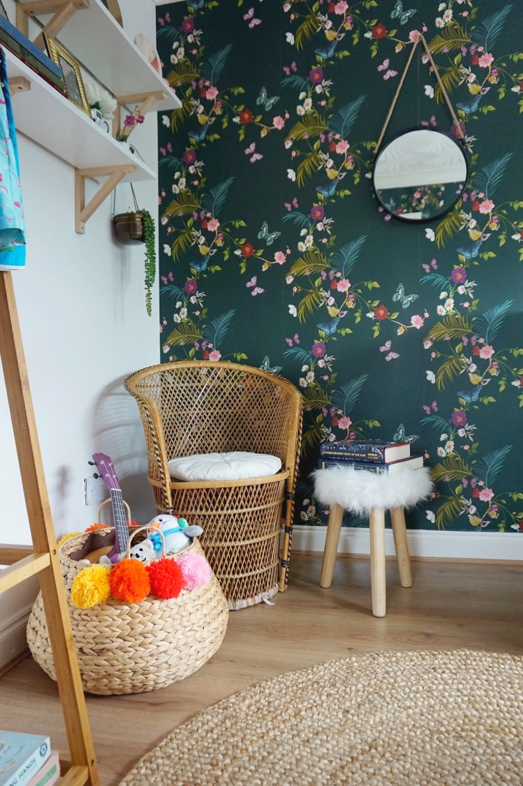 I thought the wallpaper would work well with medium wood tones, rattan, white and light pink, and sheepskin. Things like the sheepskin rug is vintage, which she already had, and I picked up the little rattan chair from Bygone Times recently (for £12!) The teepee was a 1st birthday present off her Godmothers, something that sat unused in my bedroom until we moved her in - since it's actually been out she's constantly crawling in to read her books. A couple other new things we bought were a round jute rug from Ebay, La Redoute basket, and a clothes rail from Argos.